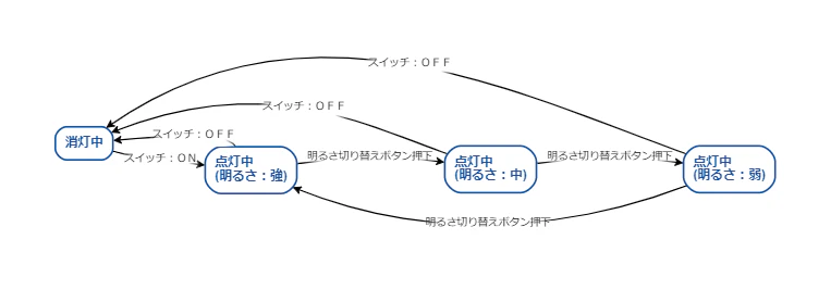 仕様から状態とイベントを識別します。上記の例では消灯中と点灯中という状態があり、点灯中には、明るさが強・中・弱の3つの状態があることから、全部で4つの状態があることが分かります。イベントは、上記の例では照明機器のスイッチON・OFFと、明るさ切り替えボタンの押下があることが分かります。