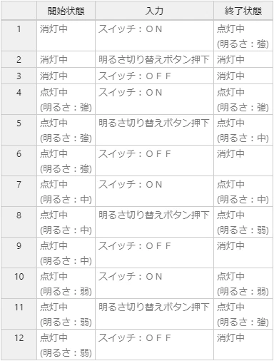 識別した状態とイベントを漏れなく行と列に記述します。上記の例だと「消灯中」「点灯中(明るさ:強)」「点灯中 (明るさ:中)」「点灯中 (明るさ:弱)」の4つの状態を行に、「スイッチ:ON」「明るさ切り替えボタン押下」「スイッチ:OFF」の3つのイベントを列に記述します。
