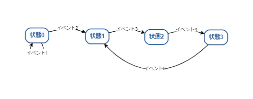 状態遷移には、ある状態から別の状態に遷移する場合もあれば、ある状態から元の状態に戻る自遷移もあります。図表1を例にすると、状態0からイベント2によって状態1に遷移するのは前者、状態0からイベント1によって状態0に戻るのは後者に該当します。