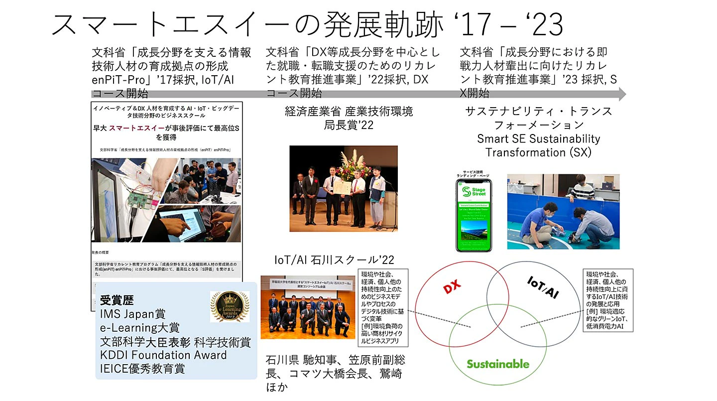 そのような理念を踏まえて、IoT /AIやDX教育におけるサステナビリティの観点の横断的な組み入れ、さらには、そうした人材育成活動の持続化を軸としたスマートエスイーのサステナビリティ・トランスフォーメーションに取り組んでいる。