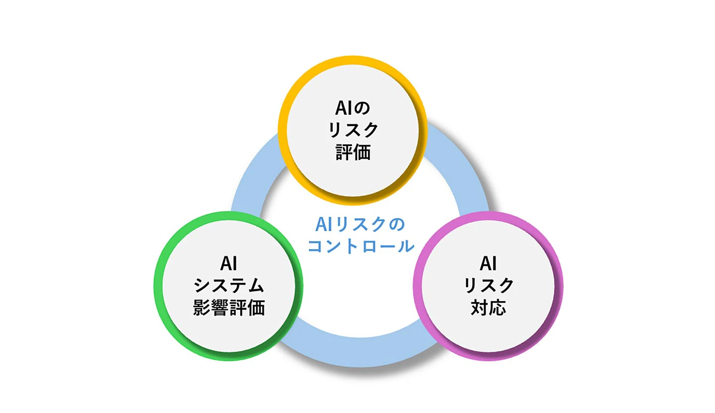 リスクに対処するための具体的な行動の柱として、(1)AIのリスク評価、(2)AIリスクへの対応、(3)AIシステムの影響評価、の3つが挙げられており、これらを基本としてリスクのコントロールを図ります(図表2)。また、AIシステムに特有の考慮すべき課題として、例えば倫理的事項、透明性、継続的な学習などを挙げており、これらをマネジメントシステムに反映するためのガイドを示していることも特徴です。