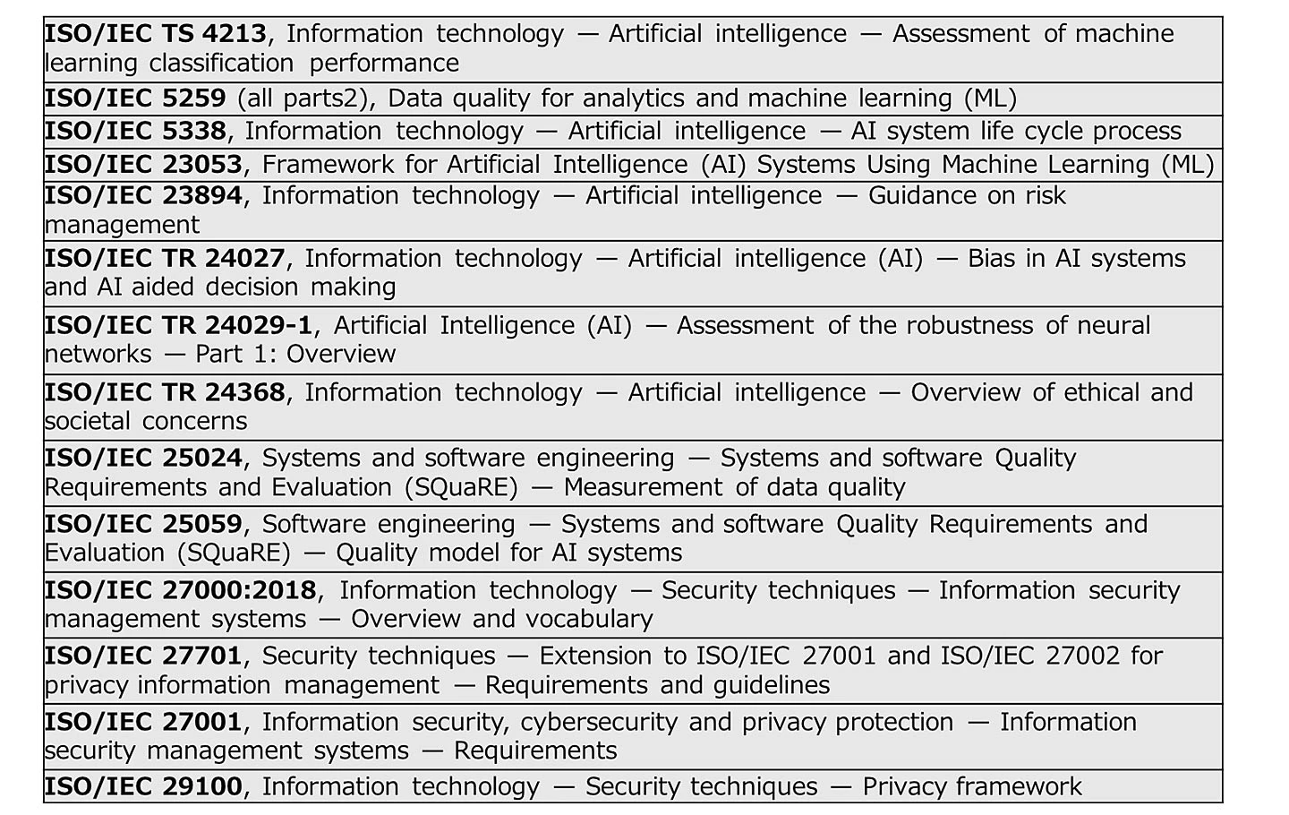 例えば、機械学習における分類モデルの推奨メトリクスに関しては「ISO/IEC TS 4213」を、AIの意思決定に存在するバイアスやその評価指標については「ISO/IEC TR 24027」などを参照することが推奨されています。同様にリスク評価に関しても、組織が抱えるリスクの種類や量、実装方法などのガイドラインとして「ISO/IEC 38507」が、AI に関連するリスクを管理する方法に関する文書として「ISO/IEC 23894」が挙げられています(図表3)。