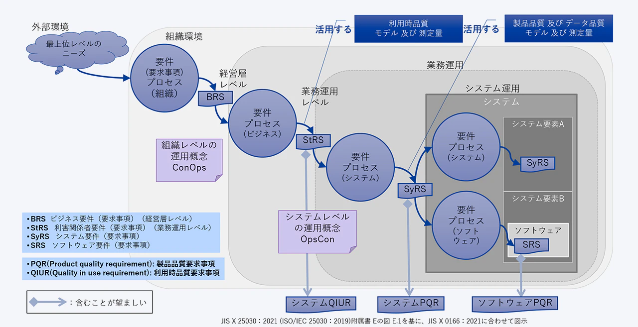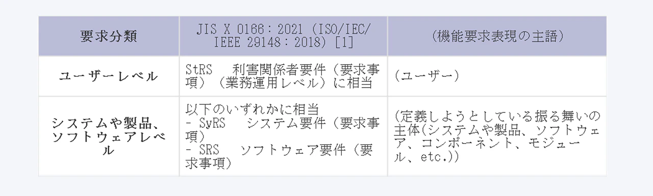 ※2) 本稿では、以降「要求」に統一します。ただし、規格を引用およびそれについて説明する際には、その規格の表現をそのまま使用することにします。日本国内では、「要求」と「要件」を区別する流儀や現場も少なくありませんので、JISにおいても「要件(要求事項)」の表現が使用されることがあります[4]。対応する国際規格ではこれらは「requirement」であり、「要求」と「要件」の区別はありません。おおむね、国内では整形式で定義されたものを「要件」と呼び、もう少しルーズに表現されたものを「要求」と呼んでいることが多いようです。規格の「requirement」は整形式で定義されるべきものなので、ルーズに表現された国内でいうところの「要求」は、その手前の「ニーズを表出化したもの」といった位置付けだと捉えておくと良いでしょう。