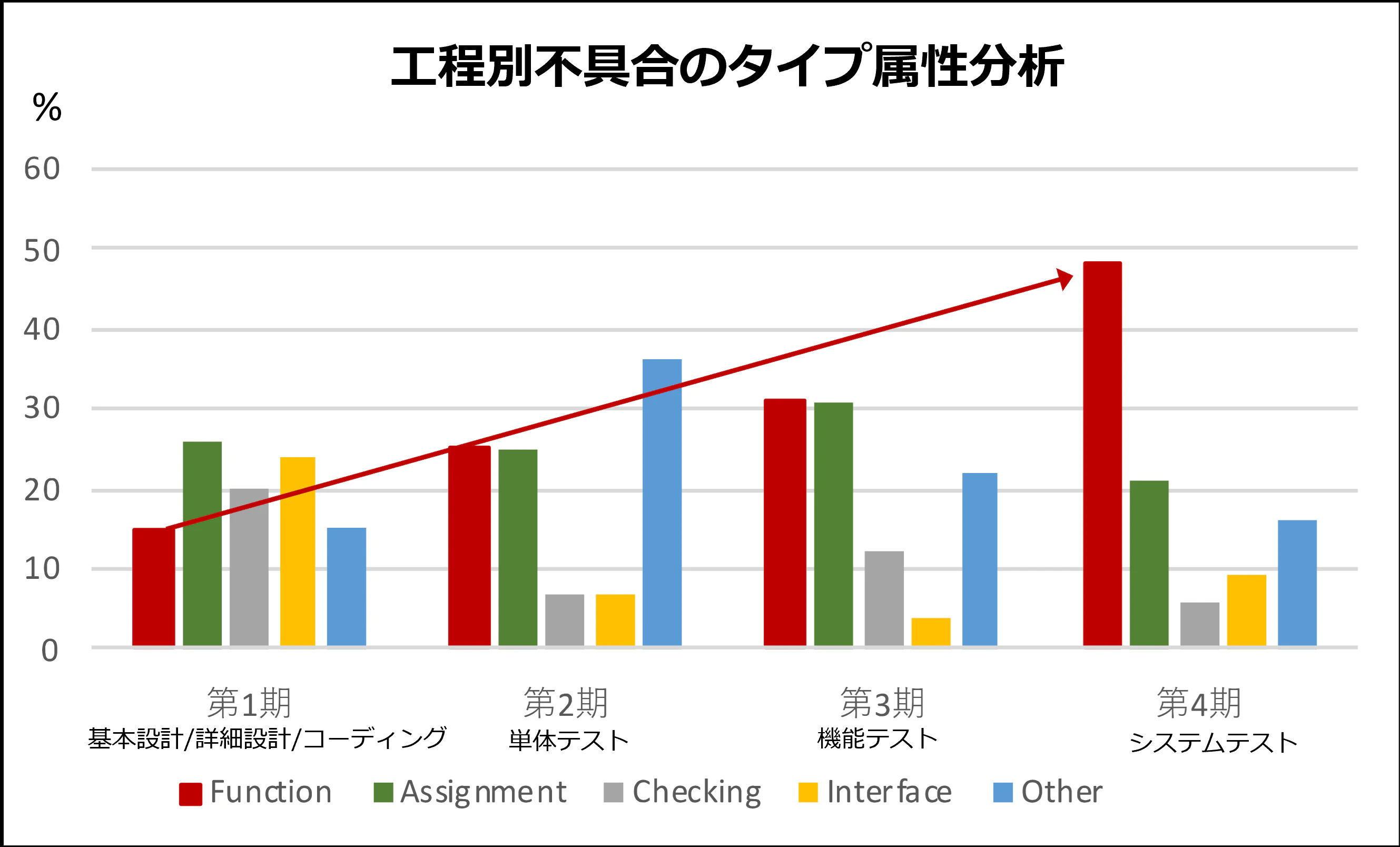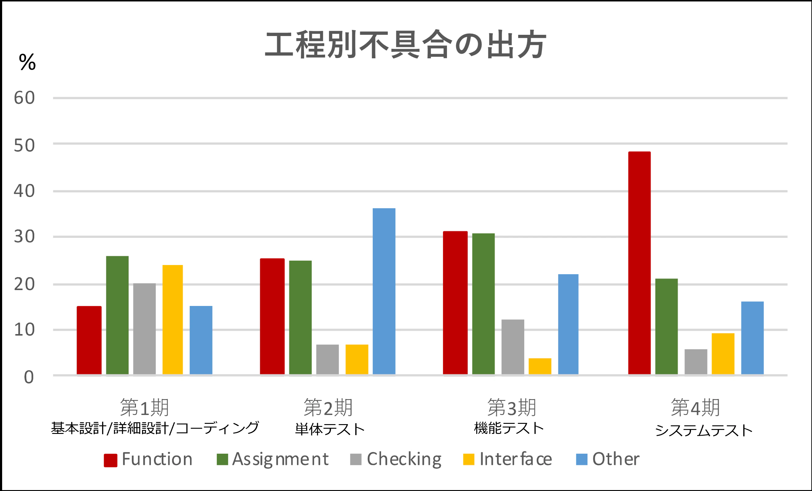 この事例では開発前半でのFunctionの不具合の割合が他と比べて特に多くないことから、各工程での検証が不十分で、Functionの不具合が後工程へ漏れて残存していることを示している、と捉えることができます。