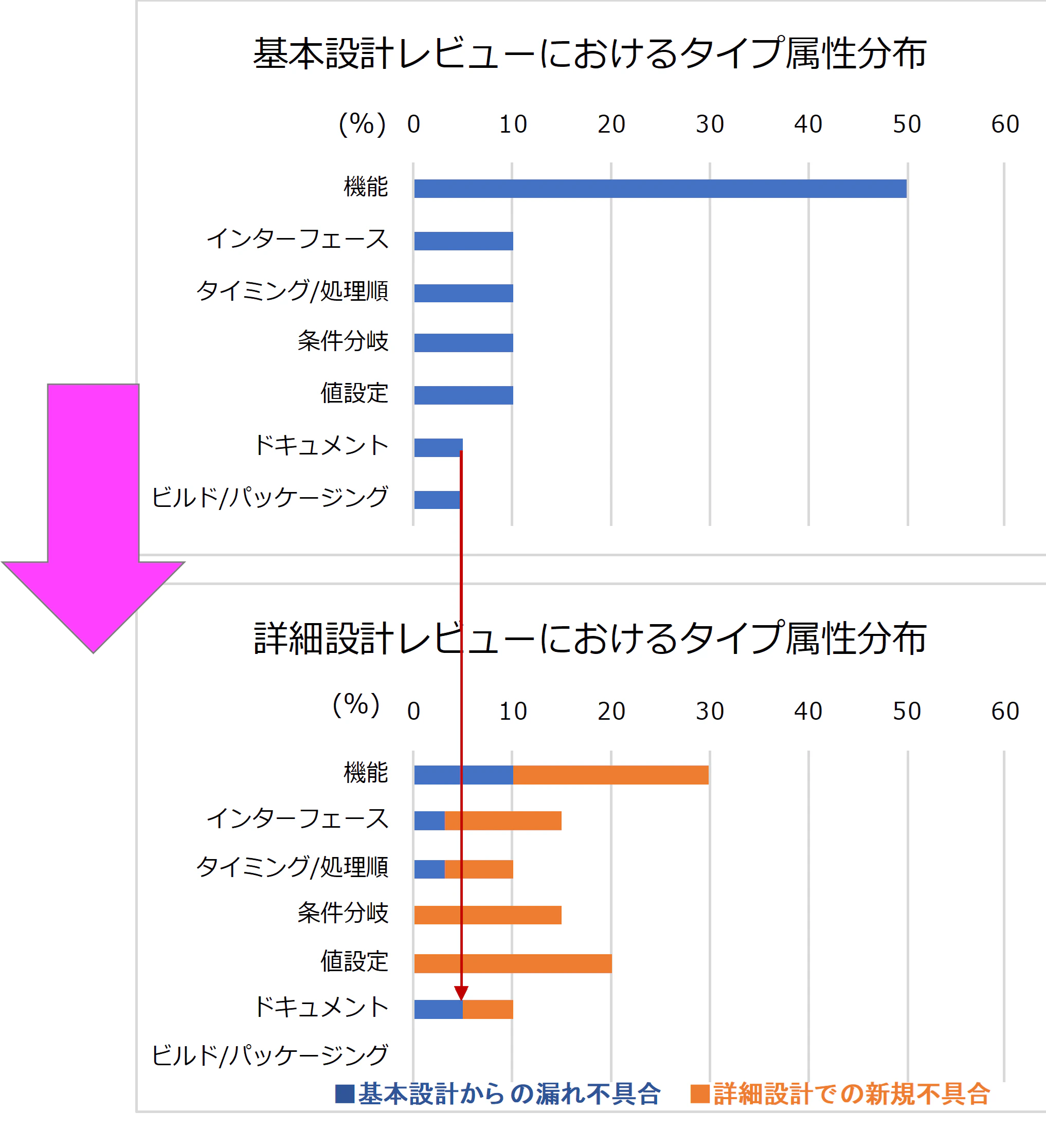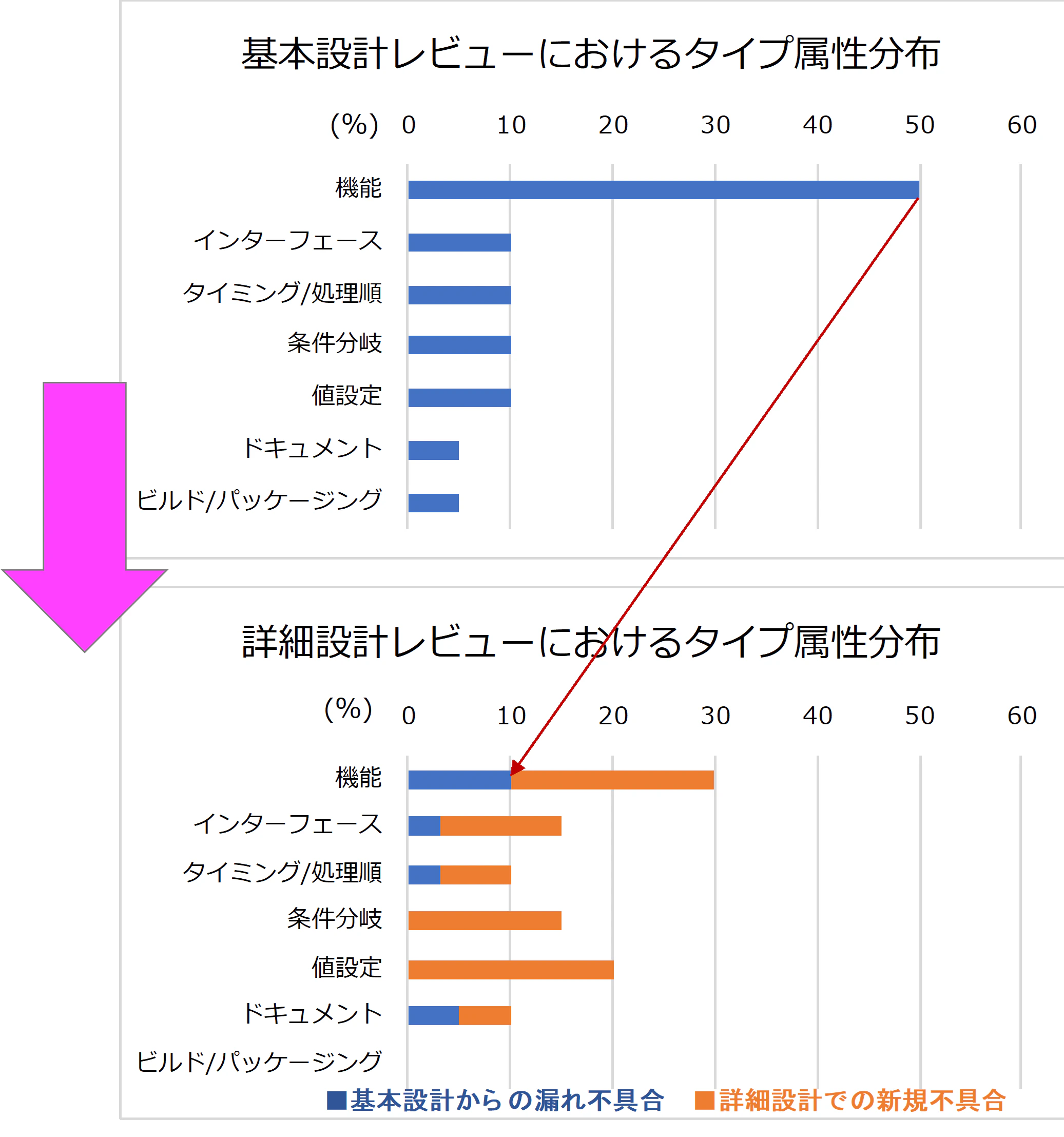 しかしながら、次工程の詳細レビューでも、30%はFunctionに関わる不具合が摘出され、さらに、そのFunction不具合の1/3が、基本設計レビューで見つけるべき不具合でした。(図表6の赤矢印)