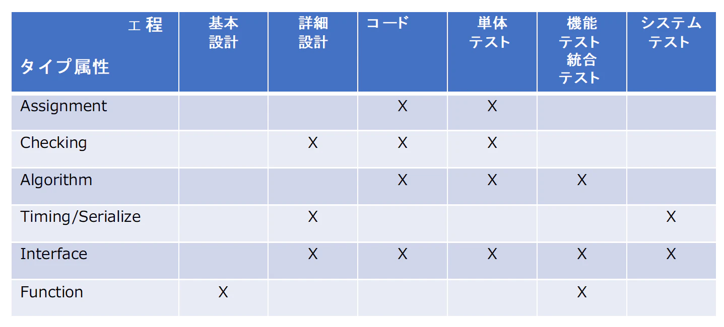 しかしながら、ここで各工程で発見された不具合についてODC分析を実施してみると、次のようなタイプ属性分布が示されました。(図表2)