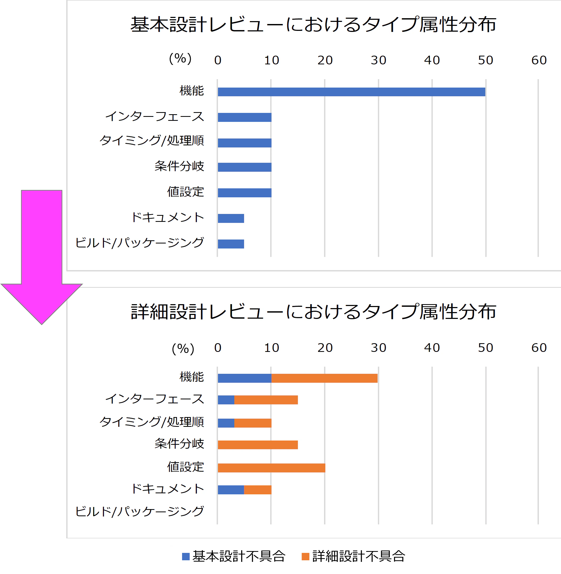 基本設計時と詳細設計時それぞれでの指摘事項を、タイプ属性による分析をし比較すると、図表5のようなタイプ属性の分布の推移を示しました。