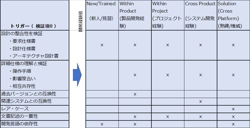 レビュー実施に際しては、レビューの範囲の偏り、抜け、漏れが起きないように、レビューア選定には広範に知識、経験を持ったメンバーを含めて臨むことが必要だということを示しています。