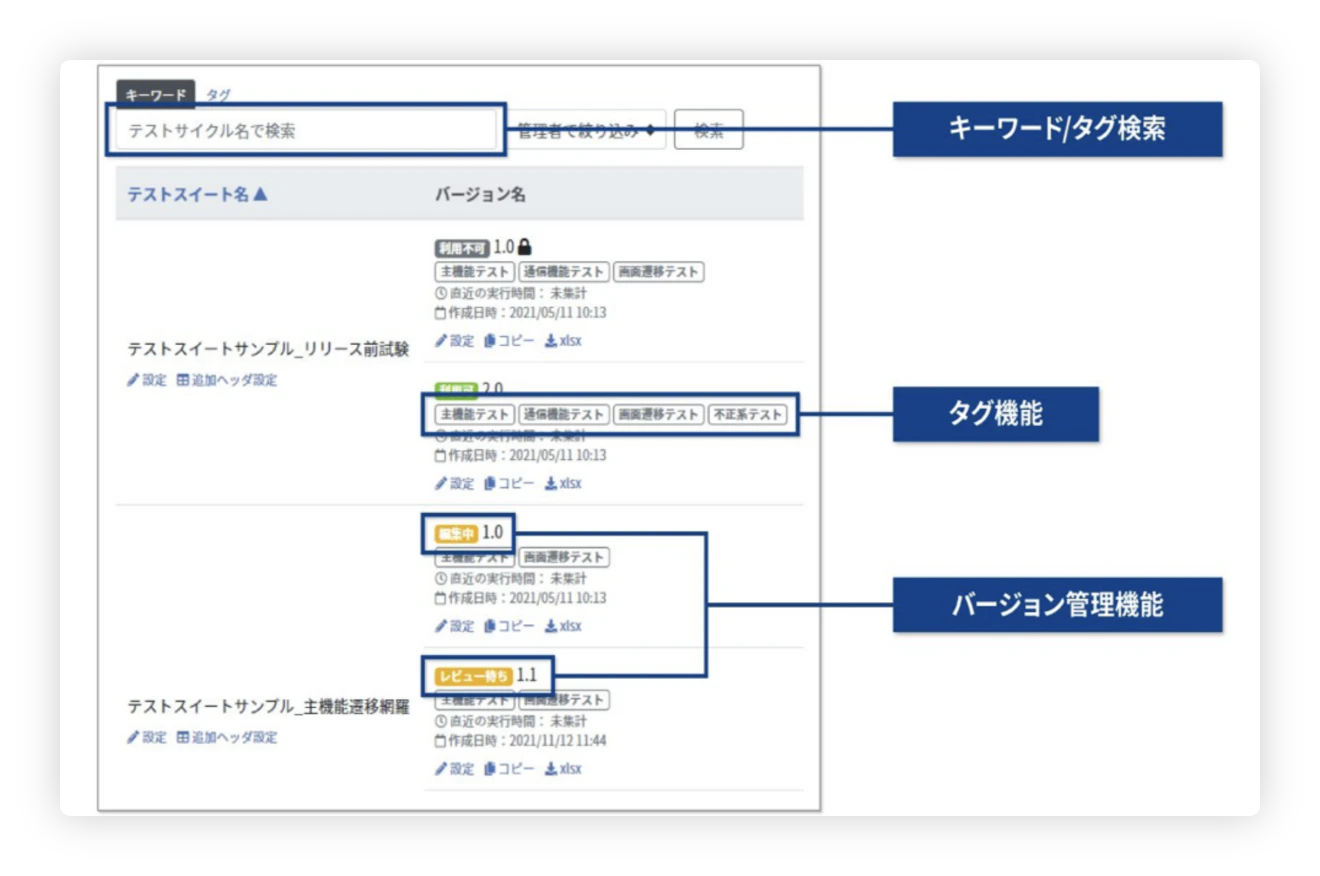 テスト管理に効率化を実現するための機能を提供しています。