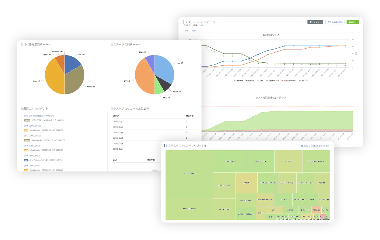 今のテスト状況を把握するダッシュボードや収束曲線グラフの他、テスト観点毎の状況を視覚的に表すカバレッジパネルなど、さまざまなレポートでの状況把握が可能です。