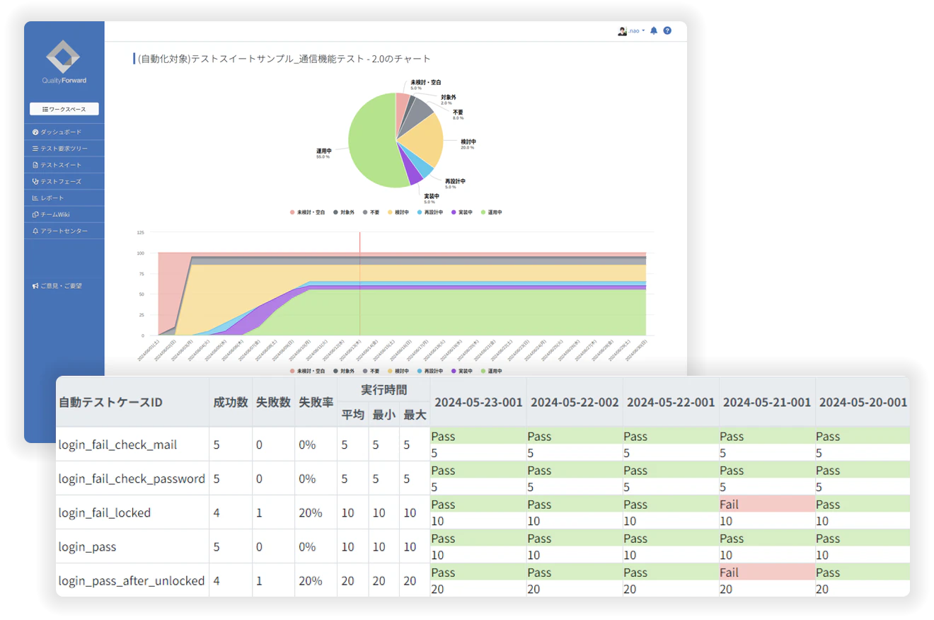 既存の手動テストケース群をテスト自動化する際に、その進捗状況を可視化し、活動のボトルネックを早期発見できます。また、WebAPIで自動テスト結果を取り込み、実行が不安定な個所を分析し、テスト実装の見直しを支援します。